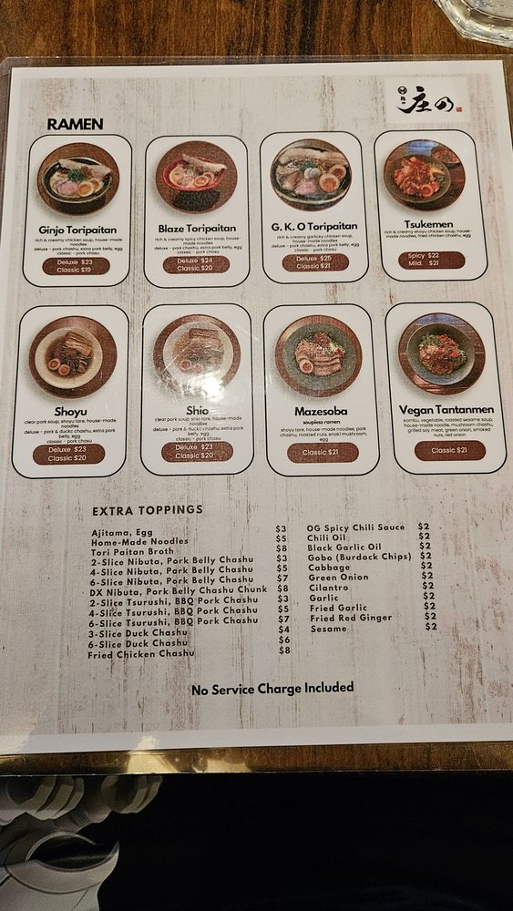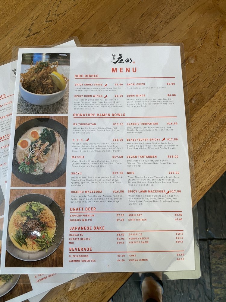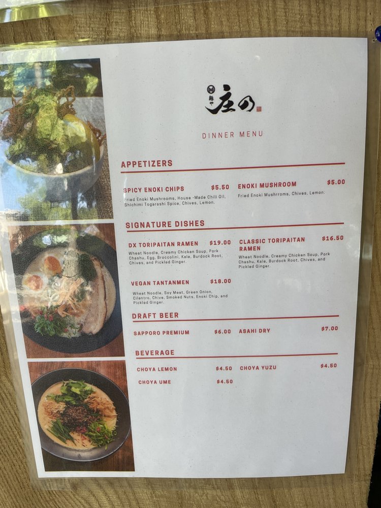 Introducing the menu at Menya Shono, a trendy ramen spot in San Rafael, CA. This restaurant offers a variety of vegan options and limited vegetarian choices. With excellent service and a delicious menu, customers keep coming back for their thick and rich broth ramen. The chicken kaarage is a must-try, although some reviewers note it could have more crunch. Outdoor seating, free Wi-Fi, and gender-neutral restrooms make for a comfortable dining experience. While some customers mention sticky tables and stand-offish waitstaff, the overall consensus is positive. Don't miss out on the spicy vegan miso ramen and be sure to check out the happy hour specials. Menya Shono promises a unique dining experience with tasty dishes and a welcoming atmosphere.